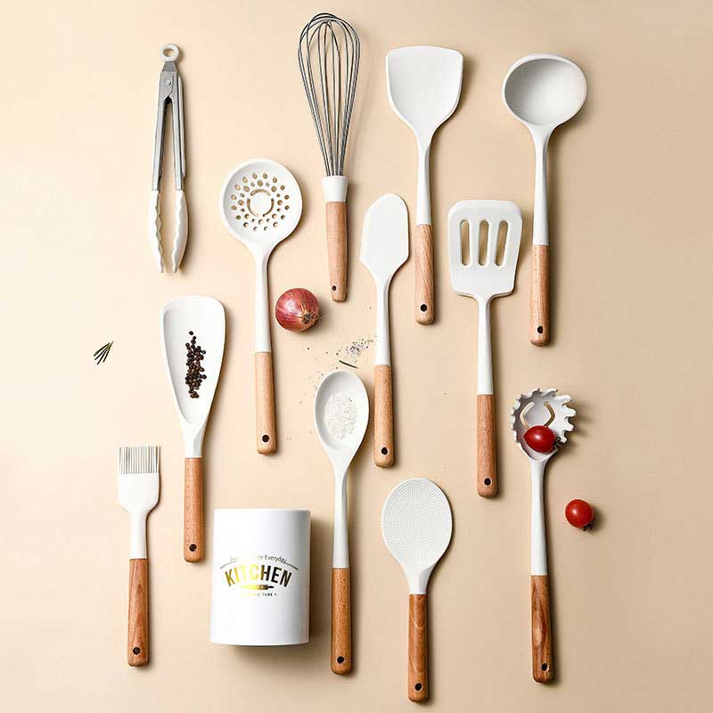Milky white wooden handle silicone kitchenware cooking set 12-piece kitchen tool set 12-piece
